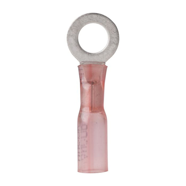 ANCOR 1/4" heat shrink ring terminals provide dependable connections for 22-18 AWG marine wiring applications. Manufactured from pure copper with tinned coating to combat saltwater corrosion while ensuring maximum current flow efficiency. The brazed seam construction delivers superior strength and longevity under vibration and stress. Each terminal incorporates heat-activated adhesive that forms a watertight seal when heated, offering unmatched vibration and strain relief for critical electrical connections. UL Listed and CSA Recognized for professional-grade reliability. This 25-pack offers excellent value for comprehensive boat rewiring projects and marine electrical installations.