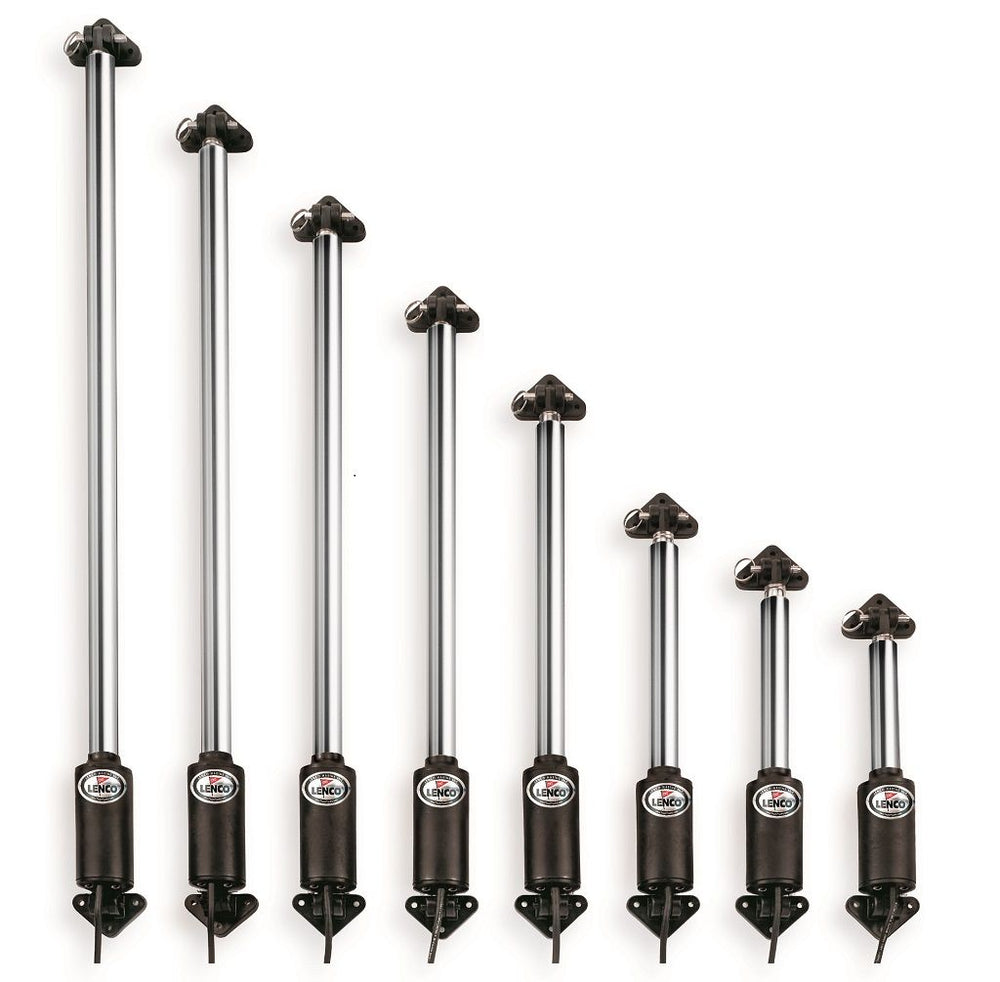 12-Volt with 2' (61 cm) leads and deutsch connectors. Inline motor design delivers over 500 lbs. of force. Includes high impact, corrosion proof mounting brackets and stainless steel pull pins.