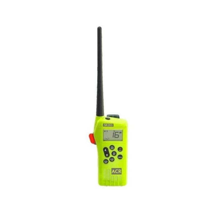 The digital display and control buttons are backlit making operation in low light environments simple. Once activated, the SR203 is automatically tuned to Channel 16 and has a single push Channel 16 call button to quickly return to the emergency channel. The SR203 handheld VHF radio boasts exceptional battery life of over 16 hours (@ -4°F (-20°C)) thanks to its highly efficient transmitter designed to maximize battery life. The innovative battery protection tab means the primary battery can be permanently attached to the radio without fear of losing its charge. The radio will always be available for use in times of emergency without the need to remove protective labels. Simply break off the red protective tab and the radio will be immediately ready to turn on to channel 16. For everyday use, ACR offers a lithium polymer rechargeable battery option. The quick release rapid charger provides the ideal solution for keeping the batteries fully charged. - Efficent transmitter - Rugged design - Primary Lithium battery exceeds GMDSS requirements - Protective battery tab - Non-hazardous batteries - 16 hours typical operating life - Optional rechargeable battery kit - Laser etched control buttons - High contrast/backlit digital display and keypad - 21 Channels
