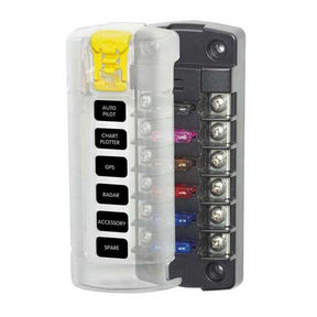 Fuse Blocks are an effective method of protection to prevent damage to wiring and possible fire in the event of an over-loaded or short circuit. This Blue Sea Systems space-saving fuse block can provide protection for new installations or when the panel has run out of breakers. Often used for electronic installations, this fuse block can be fed by breakers from the distribution panel and supply power to 6 circuits. Compact size allows it to be installed in tight spaces close to the loads they protect. Accept ATO/ATC fuses that provide protection from 1 amp to 40A.