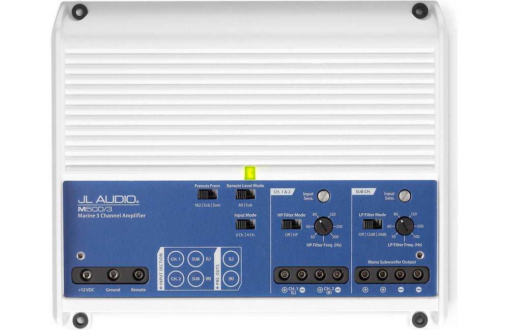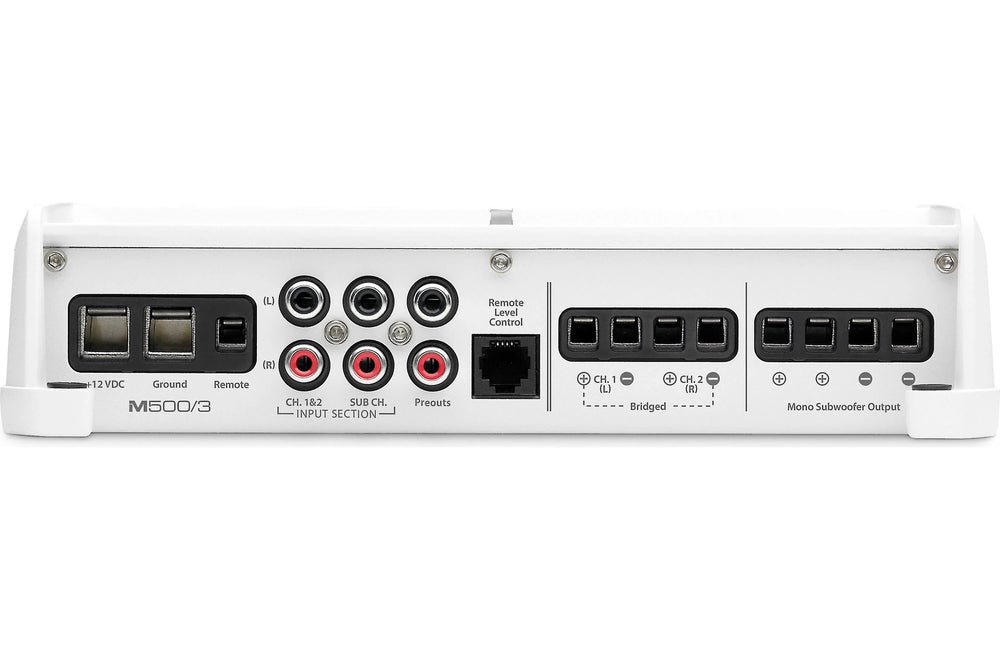 Thanks to Class D technology, all this performance comes in a low-profile package, so this amp is great for boats where space is at a premium. Even though it's likely to be installed below deck, JL Audio designed this amp to withstand the extremes of life on the water. In addition to a durable white and gray powder-coat finish, the M500/3 features a gasketed cover for the controls and stainless steel hardware.